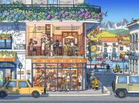 Ervaar het bruisende ritme van het dagelijks leven in deze prachtige dwarsdoorsnede van een levendige buurtpizzeria. Zie hoe het leven zich op verschillende niveaus afspeelt: bakkers maken verse pizza's in de keuken op de bovenverdieping, gasten genieten van hun maaltijd in het gezellige restaurant op de begane grond, en de sfeervolle straat beneden gonst van de activiteit. 50cm x 70cm